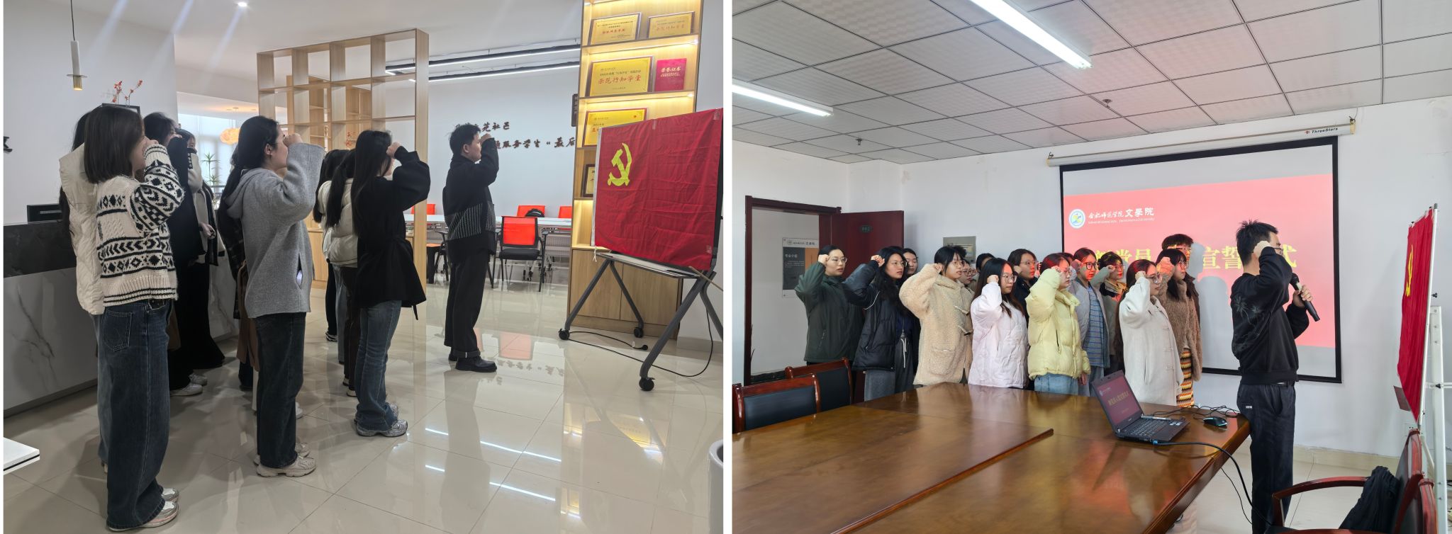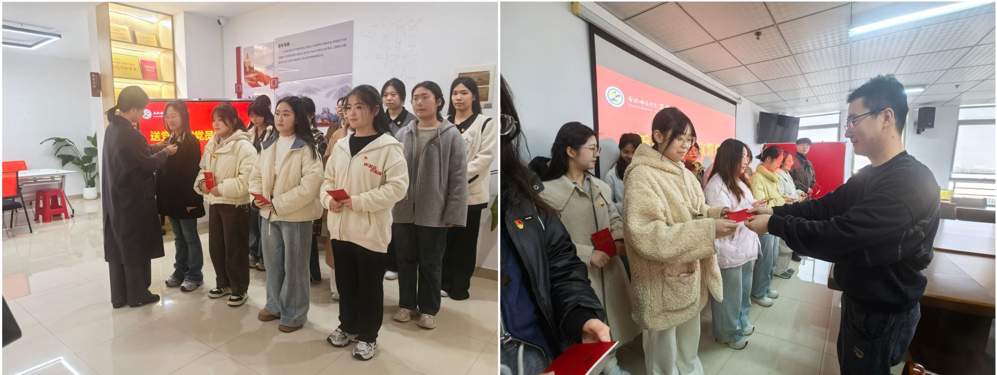 根据学院党员发展工作安排,12月10日中午,yl9193永利集团2025年下半年新党员入党宣誓仪式分别在锦绣校区学院会议室、滨湖校区“集萃文苑”一站式社区同步举行,学院党委书记许锃、副书记夏娟、各学生党支部书记以及下半年新发展党员参加。党支部书记疏淑进、曹甜甜分别在两校区主持宣誓仪式。