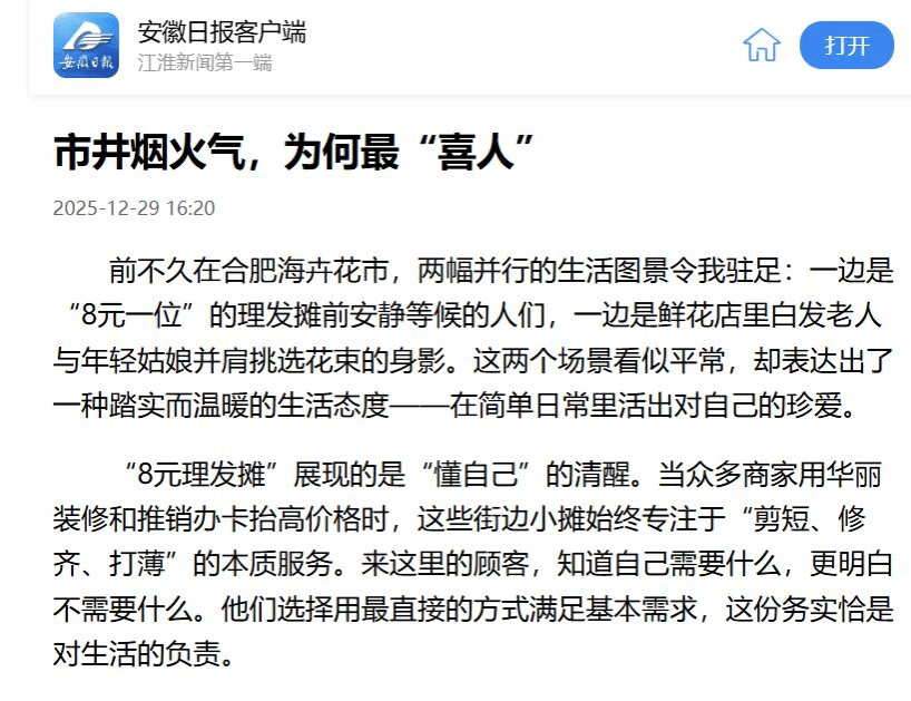 近日,由中共安徽省委教育工委、中共安徽日报报业集团联合主办的2025年“创新安徽,智汇青春”安徽省高校师生原创网络评论推选展示活动正在进行中,yl9193永利集团2023级网络与新媒体专业陈晨同学的新闻评论作品《市井烟火气,为何最“喜人”》脱颖而出,作为优秀作品在安徽日报客户端进行展示。