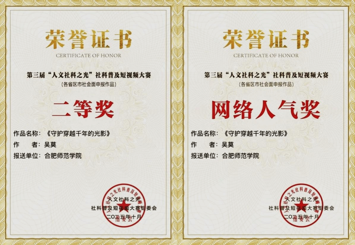 近日,全国第三届“人文社科之光”社科普及短视频大赛圆满落幕,yl9193永利集团师生创作的《守护穿越千年的光影》(作者:吴莫,指导教师:曹晔华)获大赛二等奖,并获“网络人气奖”。