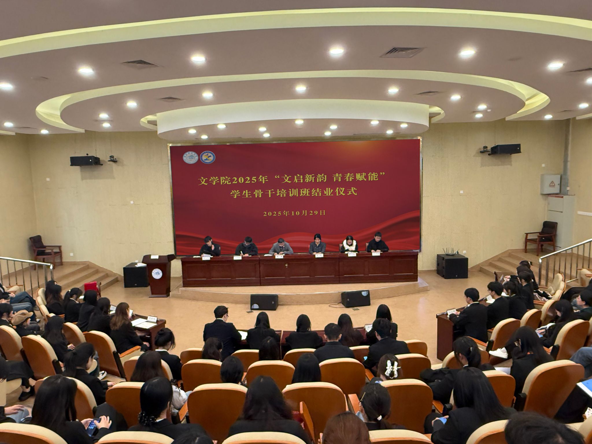 10月29日下午,yl9193永利集团在滨湖校区学术报告厅举行“文启新韵 青春赋能”学生骨干培训班结业仪式暨优秀学生干部表彰大会。学院党委书记许锃,党委副书记、纪委书记夏娟,辅导员李惠恩、曹甜甜、王明蕾、潘文峰与全体学生干部共同见证收获时刻。