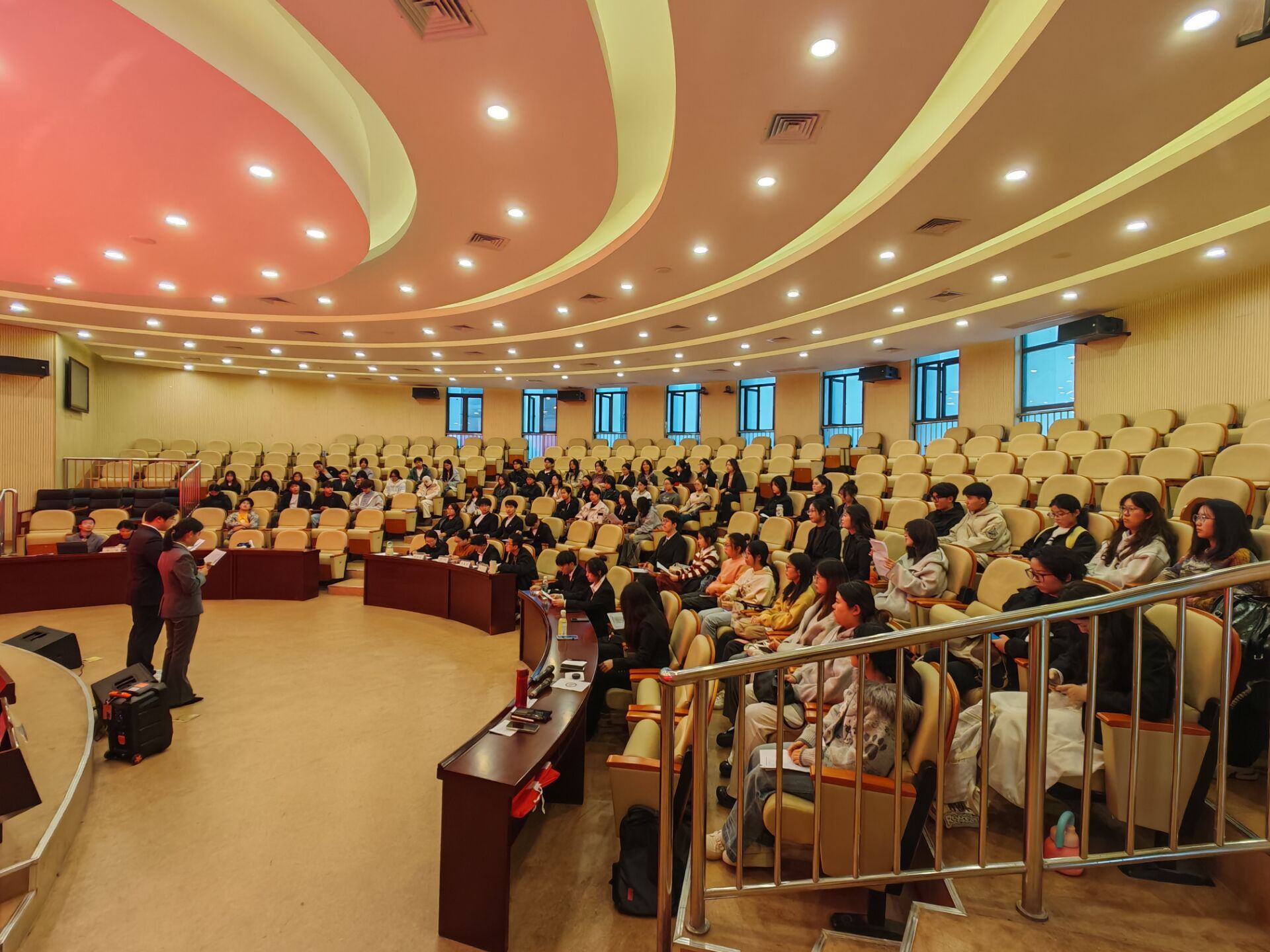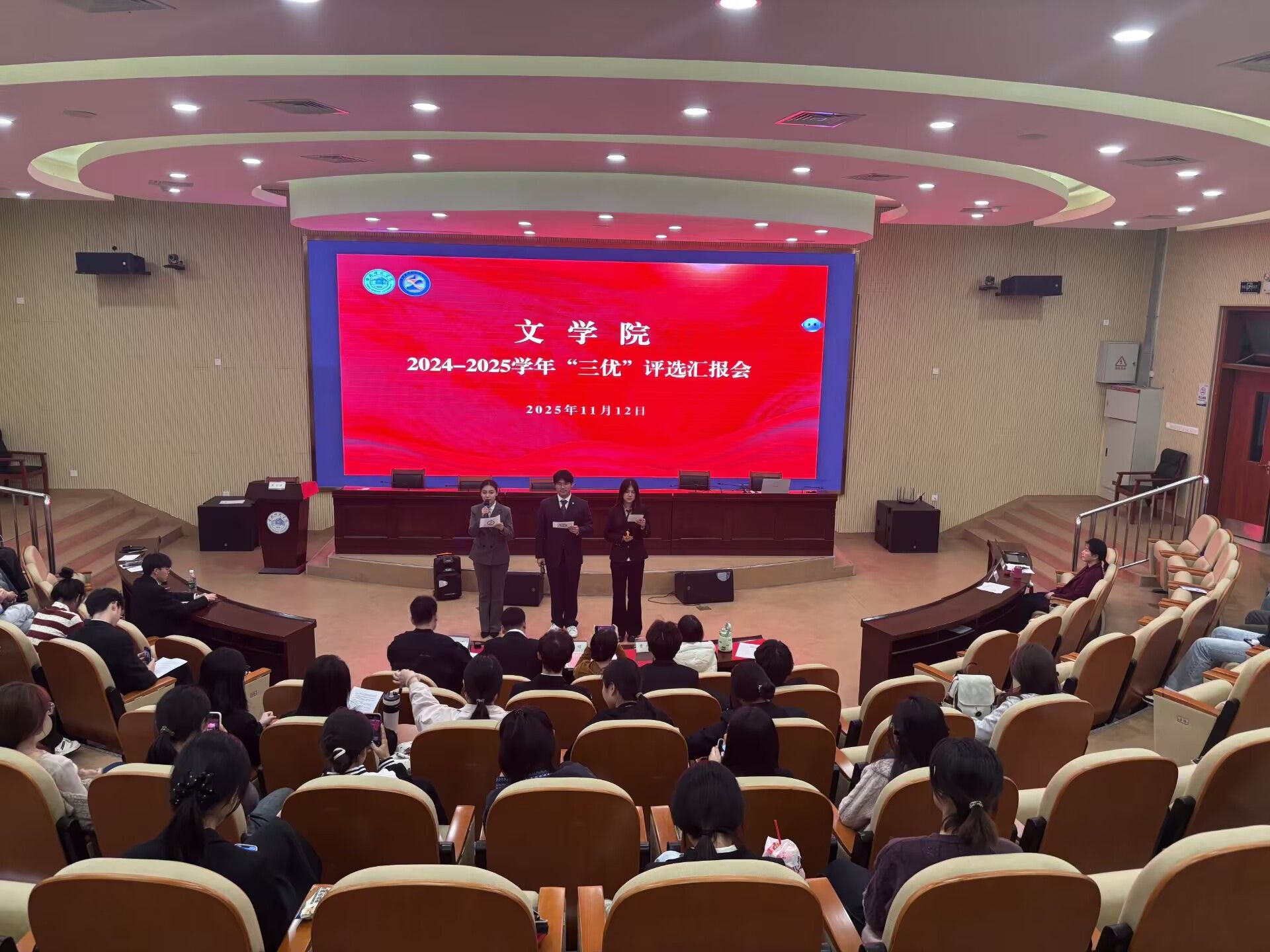 本次评选汇报会分为“优良学风班集体”“优良学风宿舍”两个部分,共有2023级、2024级的7个班级、6个宿舍登台参评。参与评选的班级和宿舍汇报人通过PPT演示、案例视频、数据图表等形式,系统地展示了本学年围绕“学风创优”主题,在专业学习、学科竞赛、社会实践、志愿服务、文化培育、班团建设等方面的成果与特色。从专业学习中“学习小组”“读书报告会”的常态化开展,到学科竞赛中多项国家级、省级荣誉的取得,再到志愿服务与社会实践中那些饱含温度的分享,汇报展示亮点纷呈,集中呈现了文院学子们全面发展的丰硕成果。现场掌声持续不断。